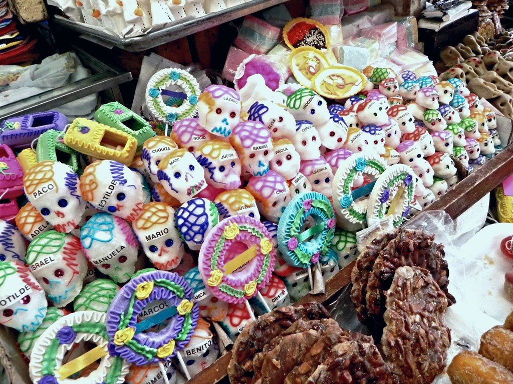 骷髏頭糖果:從造型簡單的小糖果一直到繁複的巨大藝術品都有。來源主要是因為西班牙殖民前的阿茲特克時期,人們會保存心愛之人的顱骨作為紀念,而現在習俗演變成為將糖骷髏頭寫上親友名字並轉送對方,代表著在百年之後依然思念(或許也很適合當成情人節禮品?但不知東方文化會不會有忌諱)