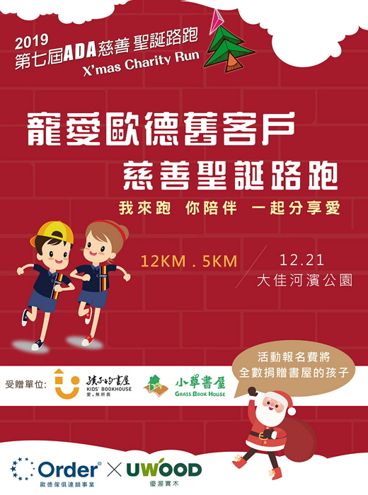 歐德集團誠摯地邀請歐德傢俱、優渥實木舊客戶,2019年12月21日(星期六)下午到台北市大佳河濱公園參加『第七屆ADA慈善聖誕路跑』。除了參與公益路跑之餘,還可共享愉悅的親子時光-小朋友來戲沙、盪鞦韆;聖誕節前夕,三五好友相約郊遊、欣賞落日餘暉、河岸夜景,一起熱鬧過聖誕。詳細路跑報名資訊,請鎖定歐德傢俱、優渥實木官網及FB粉絲團,名額有限,行動要快。