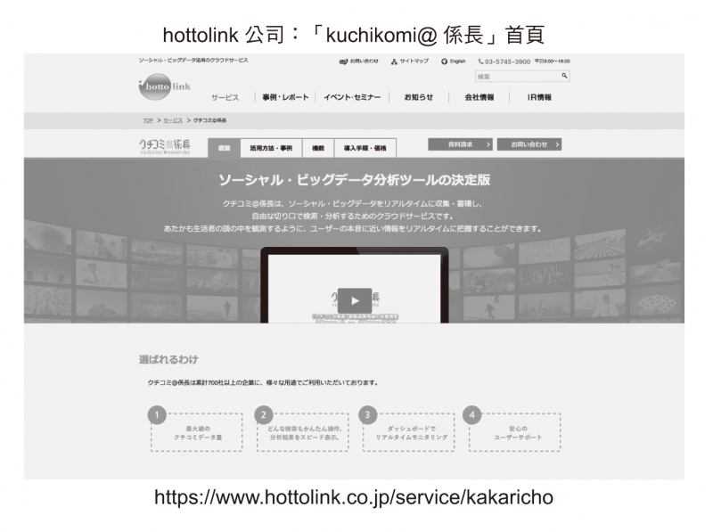 所謂的kuchikomi@ 係長,就是專攻口碑評論的雲端型(cloud)(註)社群媒體分析工具,其數據來源橫跨了部落格、推特twitter、2ch論壇和各種留言板等主要網站,堪稱是日本最大規模。
