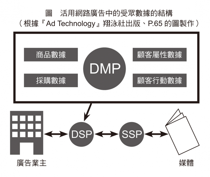 所謂的數據管理平台(DMP),就是在投送網路廣告時,為了能配合瀏覽廣告者的需求和狀態,投送出最適當廣告的平台。