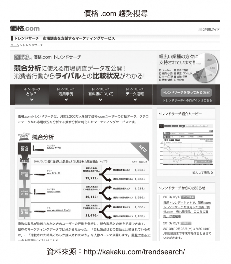 從家電到食品,各種商品、服務的價格都能比價的網站「價格.com」(kakaku.com公司),在消費者要選購家電產品之際,會依據記錄數據(log data,記錄下電腦做過一定處理的事物或尚未能實行的事物等數據)分析用戶在比較哪一類的商品,並將資料轉成「價格.com趨勢搜尋」以販售給店舖或製造商。