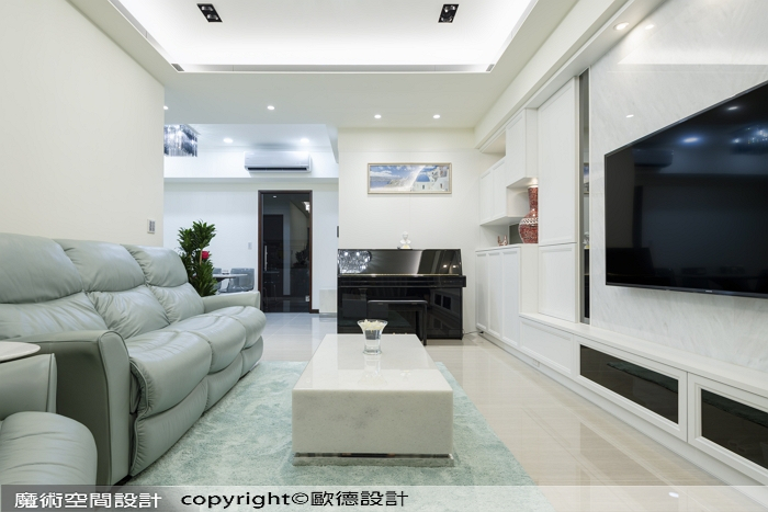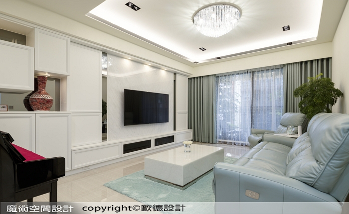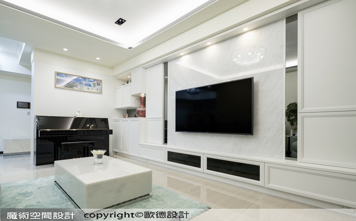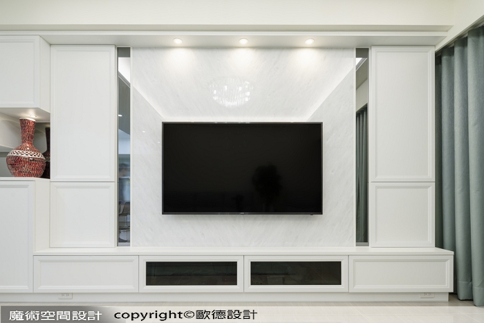 ▲電視主牆為整面的大理石牆面,利用歐德系統傢俱的美式線框門片作為電視牆面的左右造型,將收納需求與客廳的奢華大器合而為一。