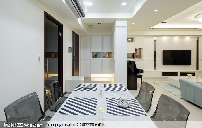 1.玄關的形成:原始格局是一個開闊的客廳,基於傳統風水穿堂煞的考量及希望能賦予玄關獨立空間,歐德設計師邱鈺珊利用系統櫃將客餐廳及玄關三分,L型的玄關收納使玄關空間成為一個獨立的廳堂,其中更將鞋子的收納與屋主收藏品的展示完美融合,一開門便令人眼睛為之一亮。