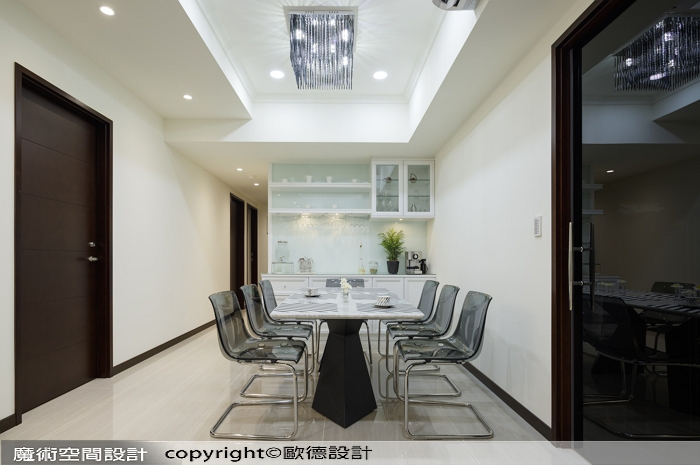 ▲餐廳區延續「明亮」、「驚艷」的主訴求,大理石餐桌搭配透明灰餐椅,上方規畫水晶吊燈,散溢低調奢華之美。