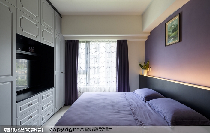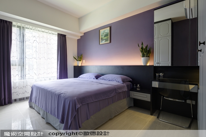 1.主臥室:主臥室床頭以深紫色乳膠漆作為整體風格的呈現,紫色給人的觀感在於靜謐、神秘、奢華,「黑」,「紫」,「灰」三色作為整個主臥室的色彩呈現,讓男女主人回到臥室就像在SPA紓壓一般的放鬆恣意,而在開門的剎那就感受到音樂的流淌。
