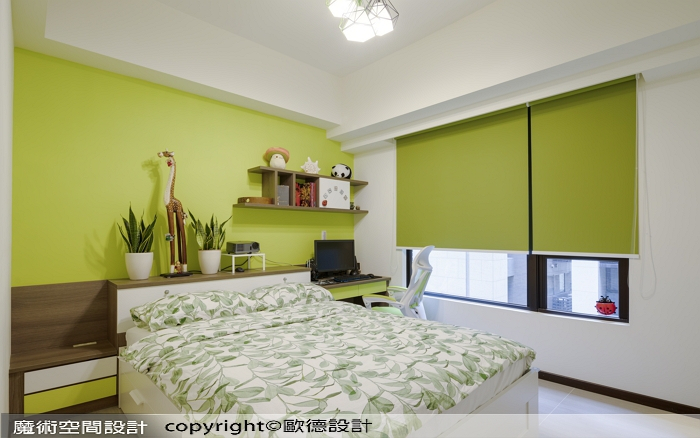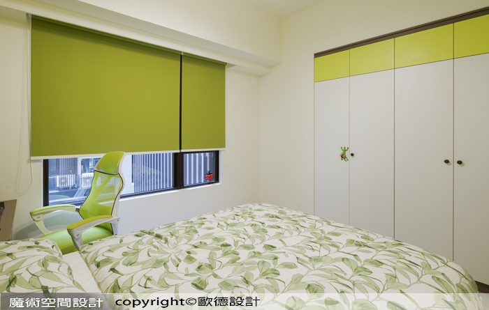 ▲大兒子臥室的主要訴求在於大自然森林意涵如身處草原,於系統櫃的選色為深色橡木,讓櫃子如同樹幹一般的沉穩,整體色調為「灰橡」、「草綠」、「雲白」。