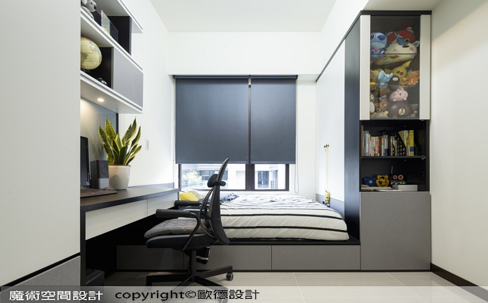 ▲小兒子房風格為現代都會風,以「黑」,「白」,「灰」三個色彩作為呈現,陽剛而簡約。