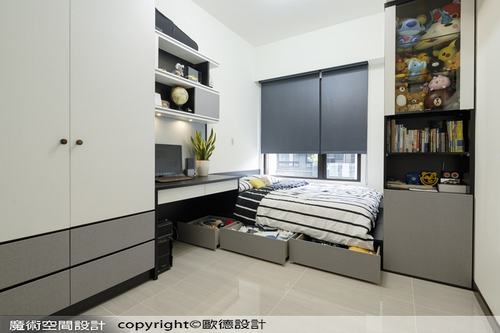 4.收納臥榻床:小兒子房間的床架不同於傳統活動床,為了創造衣櫃收納最大化,床尾合併了衣櫃及展示書櫃,床下使用歐德系統櫃做了抽屜收納,讓整個房間的收納量滿滿滿。