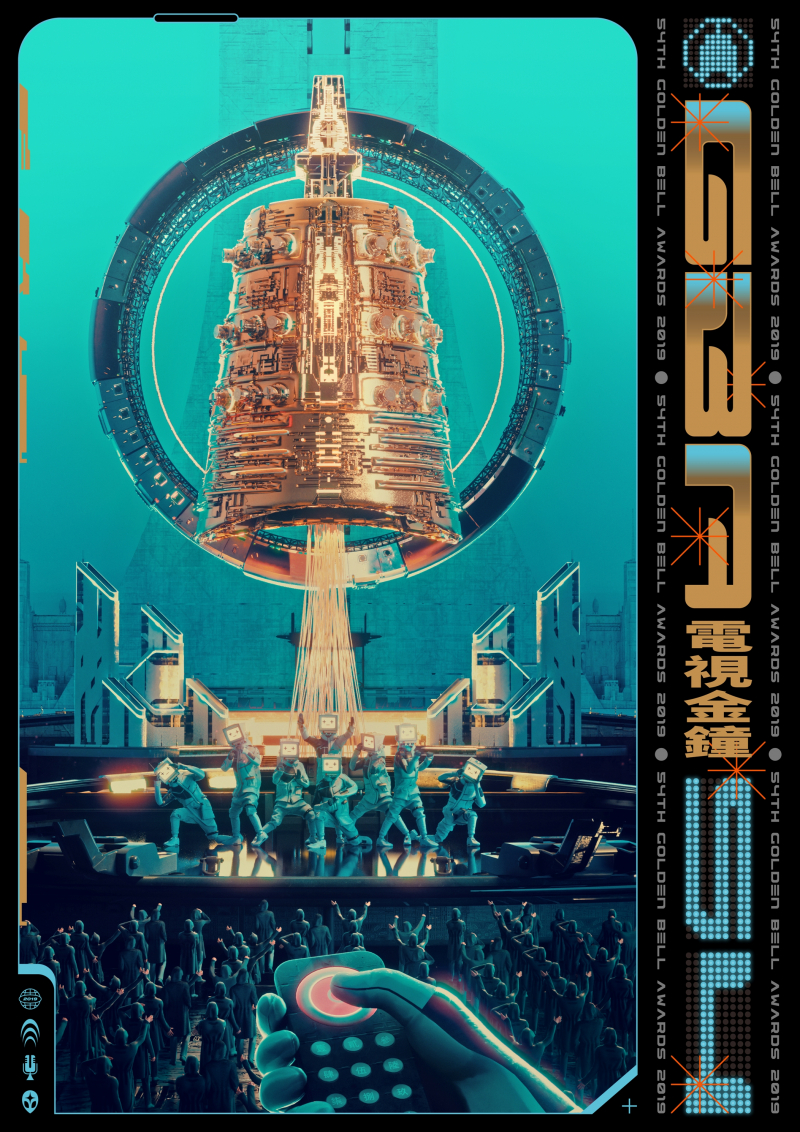 「54金鐘」的主視覺海報一曝光,可看出別於前幾屆著力於數字上的變化與設計,深具代表性的標誌「編鐘」,被大膽地呈現在海報的中心位置,廖人帥就表示:「這次我們用科幻呈現金鐘,重新詮釋顛覆後的金鐘,它像是某種巨大卻精密的儀器,形象既古老卻也前衛科技,也許正因它的包容個性,像是精神堡壘,更像艘太空船,牽動觀眾的喜怒哀樂,讓我們能夠high到外太空,更讓我們的想像力天馬行空。」而在碩大金鐘下,圍繞的守護者,正是各位電視人、廣播人,將這樣的身份具象化後,並且宛如戰隊般地動起來,一起對抗險峻環境,追求電視與廣播製作的最高榮譽。