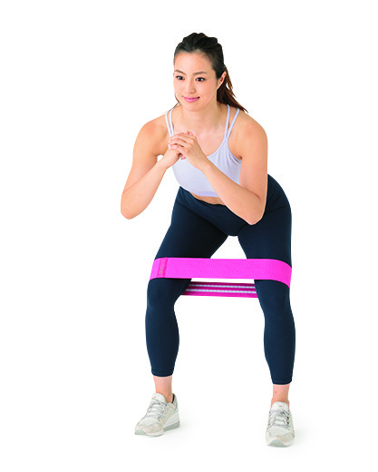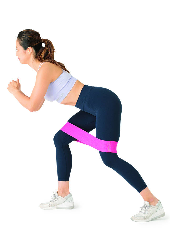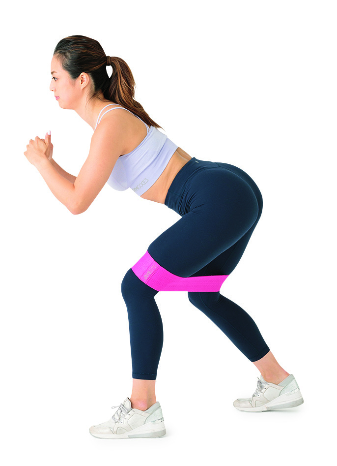 將彈力帶套在膝蓋上緣,雙腳打開略比肩寬。髖關節屈曲,臀部往後推,雙手可以於胸前交握或扠腰。