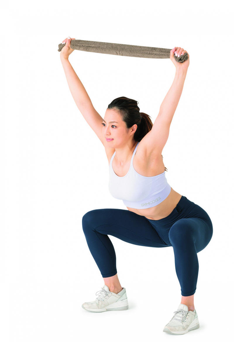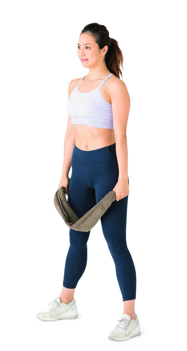 雙手握住毛巾兩端,雙腳打開略比肩寬。