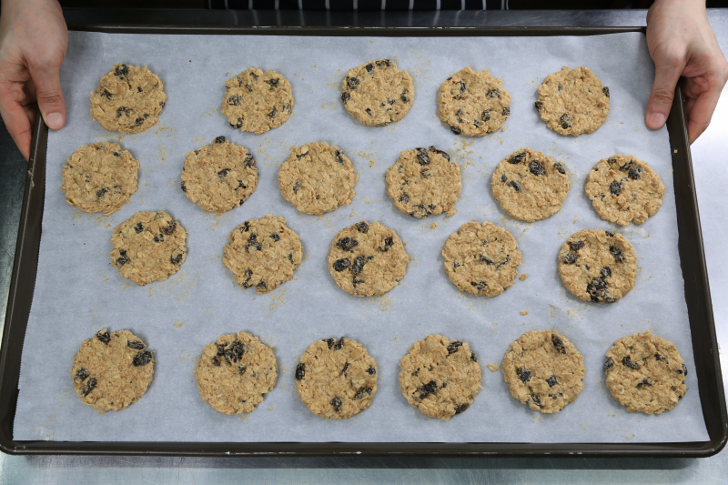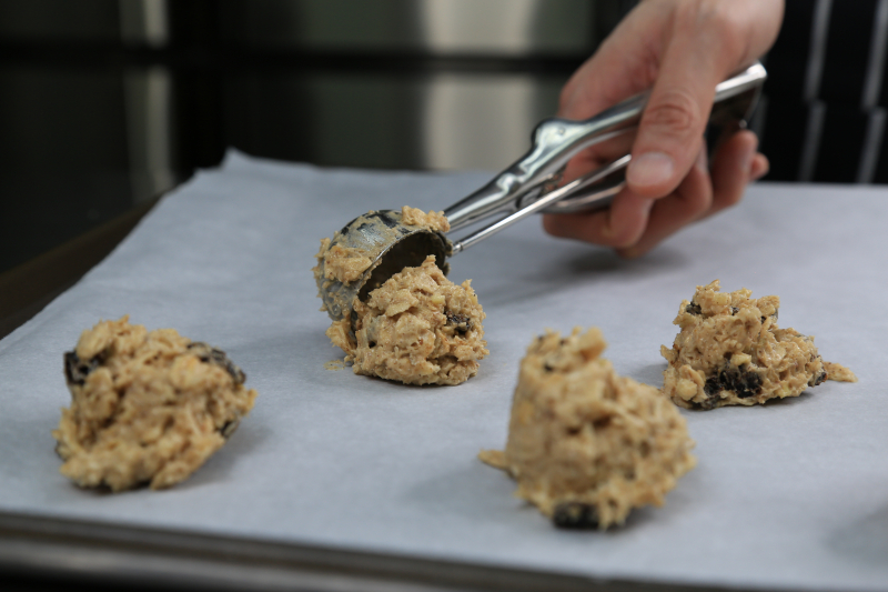 6.烤盤上鋪好烤焙紙,用冰淇淋勺將作法5麵糊挖至烤盤上,並壓平約0.5~0.8公分厚,以攝氏180度烤 12~15分鐘即可。(圖F02 016A3866+F04 016A3931)