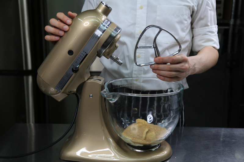- 將室溫軟化後的無鹽奶油及黑糖(或紅糖)用槳狀攪拌器攪拌均勻後,加入雞蛋拌勻。(圖B02 016A3573)
