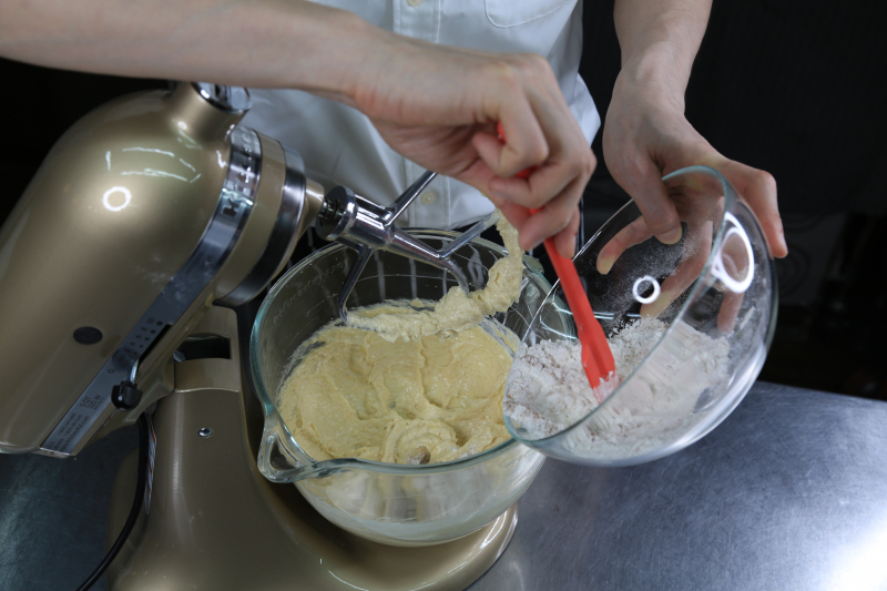 - 將過篩的中筋麵粉加入無鋁泡打粉、肉桂粉和少許鹽,加入作法2奶油中拌勻。(圖C01 016A3698)