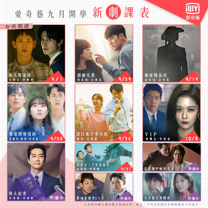 此外,除了《他人即地獄》外,九月有不少精彩韓劇陸續登場,如:金宣兒主演揭露上流社會秘辛的《秘密精品店》、張娜拉和李相侖合作的懸疑愛情劇《VIP》,喜劇類型則有《清日電子李小姐》、《很便宜,千里馬超市》等小人物奮鬥史,校園劇《無意間發現的一天》網羅新生代演員金惠允、SF9路雲及「海帶男」李宰旭共同演出,而許多粉絲引頸期盼的奇幻愛情劇《請融化我》,是大勢男星池昌旭退伍後首部作品,將在9/29於愛奇藝台灣站首播。