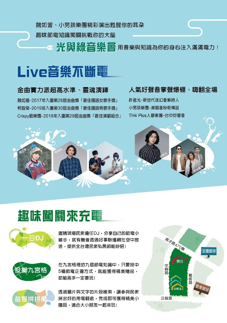 接下來前往勤美草悟道,聽今天的重頭戲《台電光與綠音樂會-節電也可以很嗨森》!
