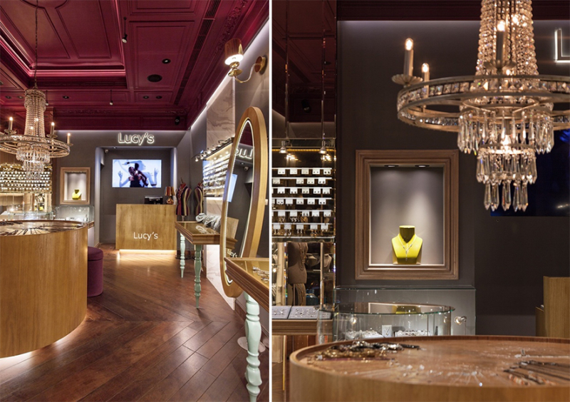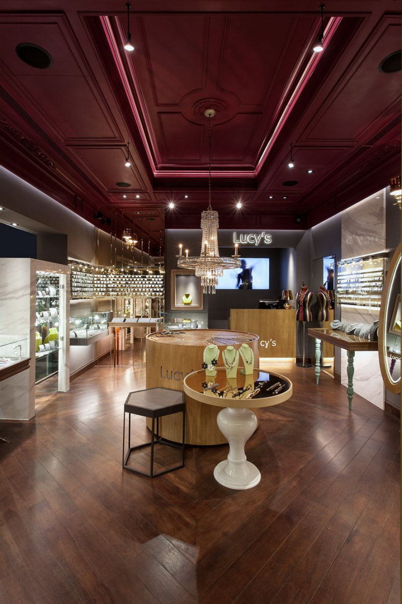 考量客群以女性消費者為主,空間著力呈現精品質感,因此延續發想中重要的「視覺衝擊」概念,於天花板暈染大片的葡萄酒紅,搭佐金屬、石材和木質立面,使空間形塑截然不同的高貴視感,讓身處其境的人們,感受帶點奢華又不感壓迫的購物體驗。此外,為避免場域顯得太過有距離,因而設計通透開放的門面,消除內外的審美隔閡,使琥珀的裂紋與晶鑽的耀眼,穿透異國歷史與人文的土壤,投向每一雙尋美的眼眸。