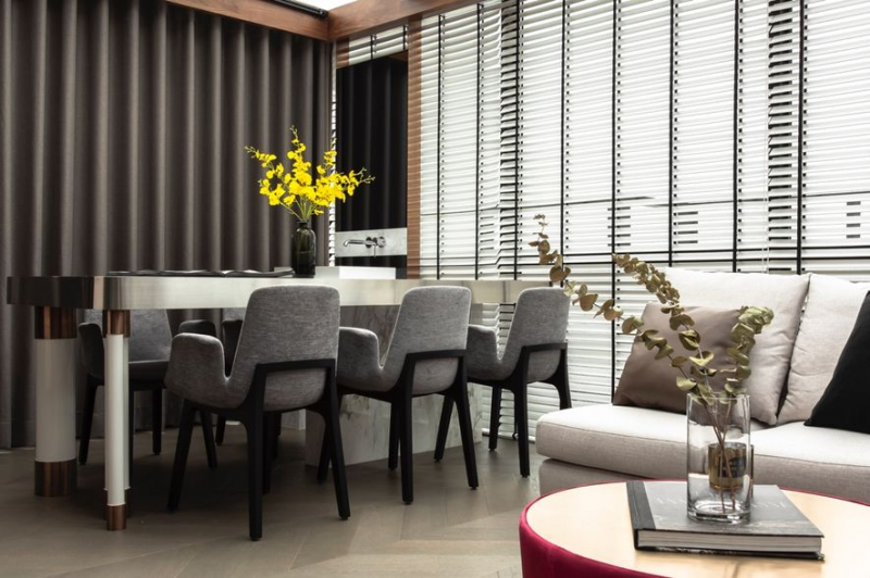 餐飲區的客製化長桌與懸空式流理台一體成型,我們將管線藏於流理臺支柱內,顧及機能之餘,也避免為了收納外露管線而加裝櫃體,所導致的厚重感;至於長桌則以石材作為主體,檯面邊緣利用鍍鈦圓角表現,桌腳亦包覆同色金屬,除了呼應電視牆與茶几外,更為聚餐時分增添高貴質感。