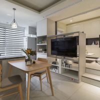 客廳則與和室結合,且地板架高40公分以增加收納空間,包含樓梯下方的抽屜或房內的儲物櫃,都讓人享有更大的物品收藏自由,而和室正中央的桌子可電動操控,隨意升降,無論三五好友在此泡茶聊天,或是來一場方城之戰都非常便利。至於餐廳與和室之間的電視櫃特別設計成穿透式,營造輕盈感受,且電視架可兩面旋轉,令空間使用效率得到進一步提升。另一方面,和室的玻璃門也可隨時拉上,可搖身一變成為客房,供親朋好友過夜休息。