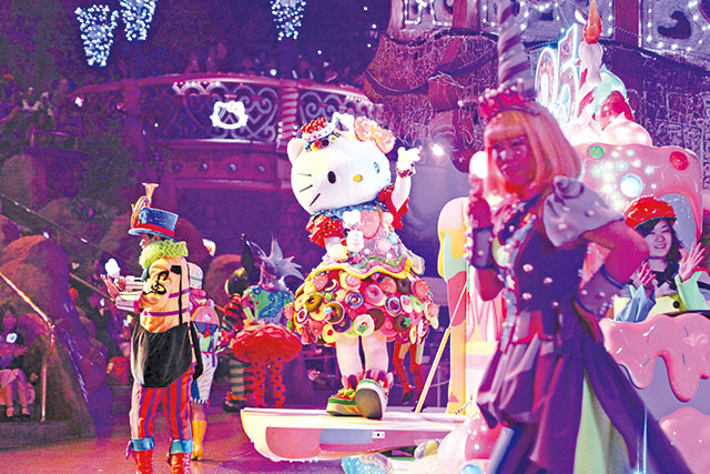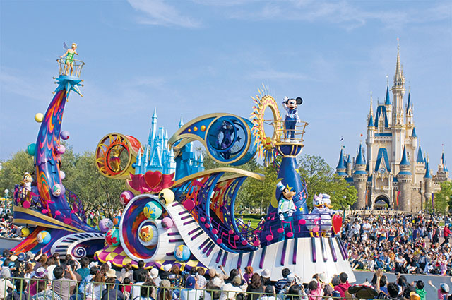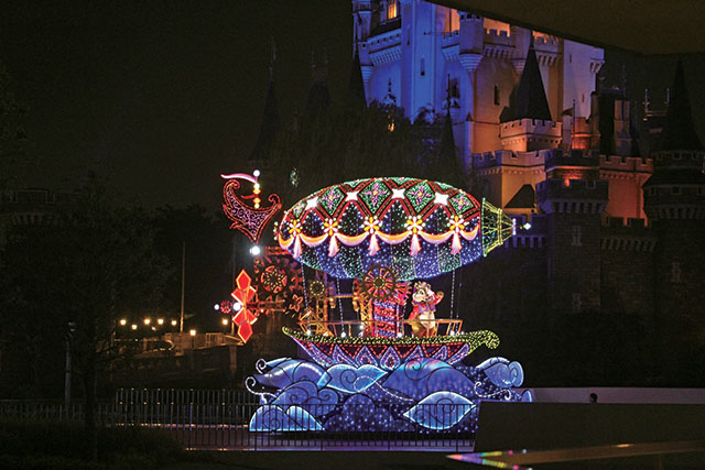 迪士尼樂園每天上演五光十色的夜間遊行,如遇雨天亦有雨天限定的花車巡遊,絕不掃興。
