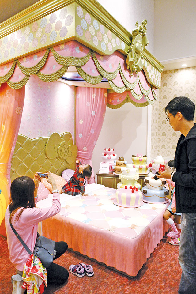 Lady Kitty House內有很多拍照位,部分更設互動遊戲。圖中小孩正看著牀上方的屏幕接著虛擬掉下來的糖果。