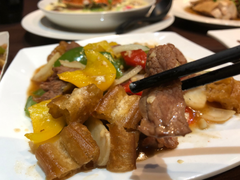 第一道端上來的是「鬼馬牛肉」這道菜主要食材是油條、以及香滑的嫩牛肉,搭配上顏色繽紛的三色彩椒,口味就甭提了,油條炸得酥脆,配上勾芡好的醬汁以及特色調味料,非常下飯,主廚說他喜歡在菜的顏色上面動點手腳,搭配了顏色繽紛的甜椒後,看起來色彩鮮豔之外,讓食物更佳的可口,再來上的是「海鮮蛤蜊蒸蛋」這就是比較偏向台式料理的菜色了,為了增加料理的風味,更是不手軟的加了一隻螃蟹在菜裡,整個蒸蛋可以吃到蛤蜊鮮味以及螃蟹的甜味,在喝了一點酒之後,更是清爽好吃,酒過三巡之後端上來的是「港式小炒王」,是店裡招牌特色菜,搭配啤酒更是絕配,最後送上的「霸王雞」更是味美多汁,而且每一份的份量都是非常的超值,價格十分的公道,也非常適合多人一起來用餐歡聚。