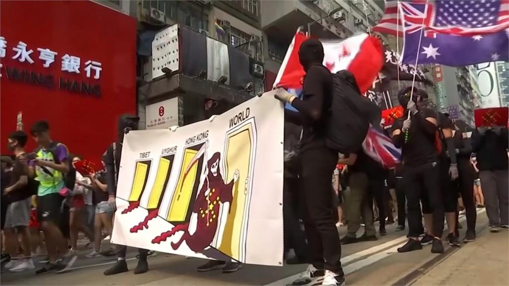 港人不滿情緒,隨著國慶的倒數越演越烈。9月29日「全球反極權大遊行」,有黑衣人特地攀上路邊國慶標語,用黑漆塗掉「中國人民共和國成立70周年」字樣,寫上「光復香港」4個大字,獲得民眾一致叫好。