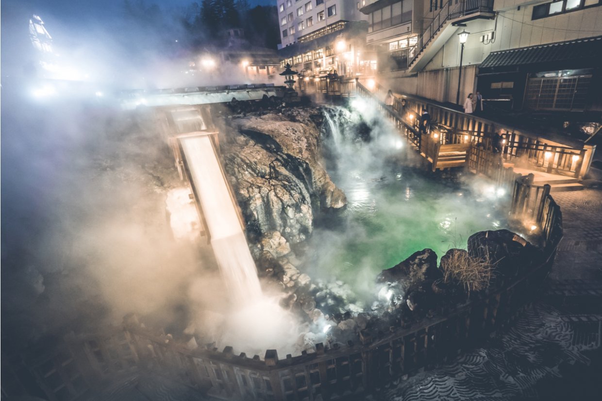 距離東京約四小時車程的草津溫泉,除了是日本三大名湯之外,其泉水湧出量也是日本第一。位於溫泉街中央的湯畑終年煙霧繚繞,熱泉水湧出後,經過「湯揉」的自然降溫後會直接送到各大溫泉會館中。草津溫泉是帶有硫磺的強酸溫泉,從江戶時代就一直備受歡迎。在草津溫泉街上也有足湯和各種設施,也可以品嚐有名的溫泉饅頭。