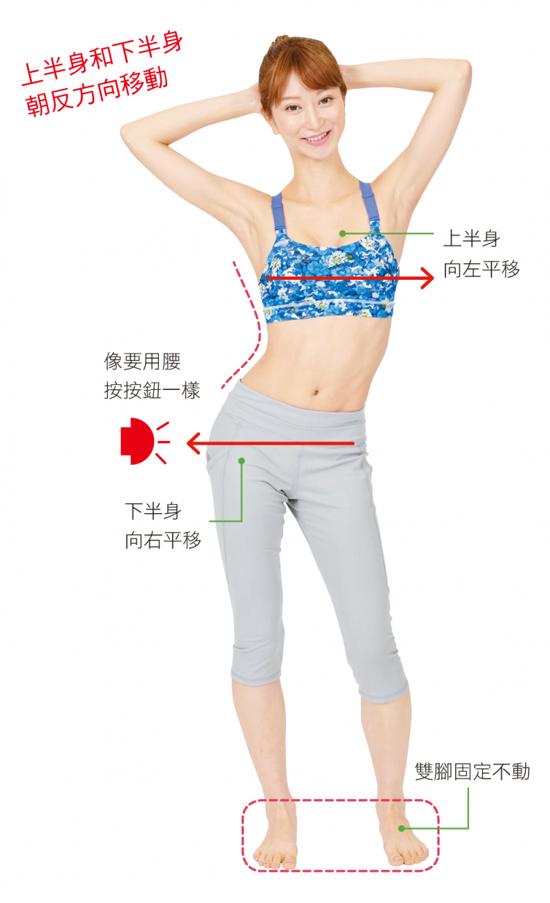 若上半身和下半身朝相同方向移動,就無法達到塑腰的效果。正確動作要如右圖,確實地朝相反方向移動。