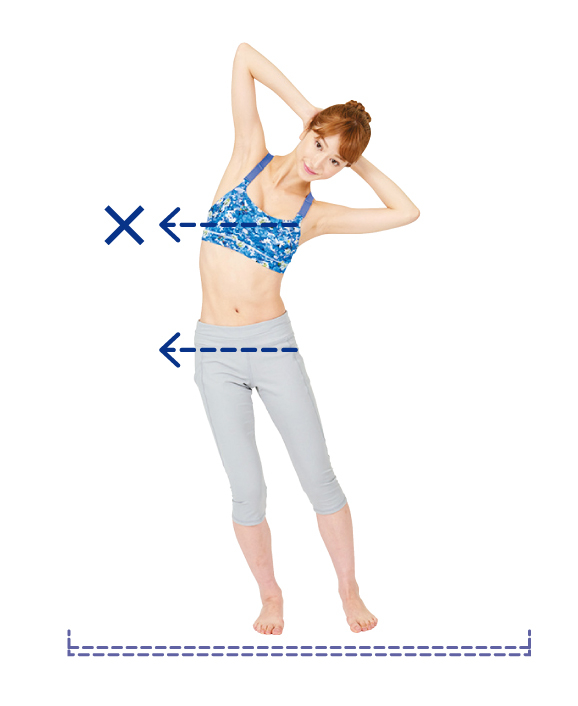 雙腳張開至肩膀的寬度,雙手放在頭部後方並交握。