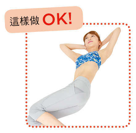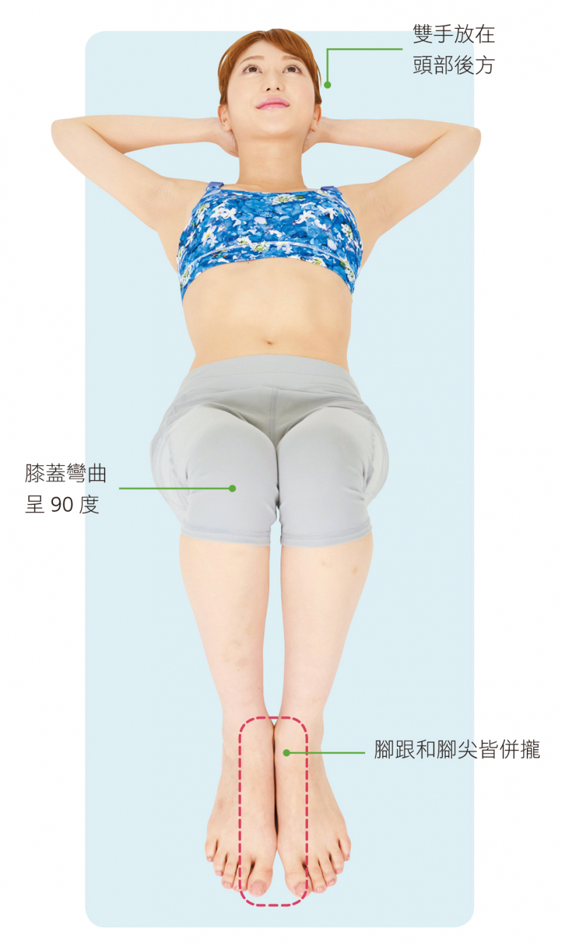 1. 膝蓋彎曲呈90度雙手放在頭部後方