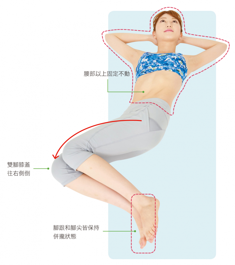用逆腹式呼吸深吸一大口氣的同時,雙腳膝蓋一起向右倒,憋住氣保持右膝貼地的姿勢5秒,讓肚子用力、慢慢吐氣回到動作1。另一邊也以同樣方式進行。