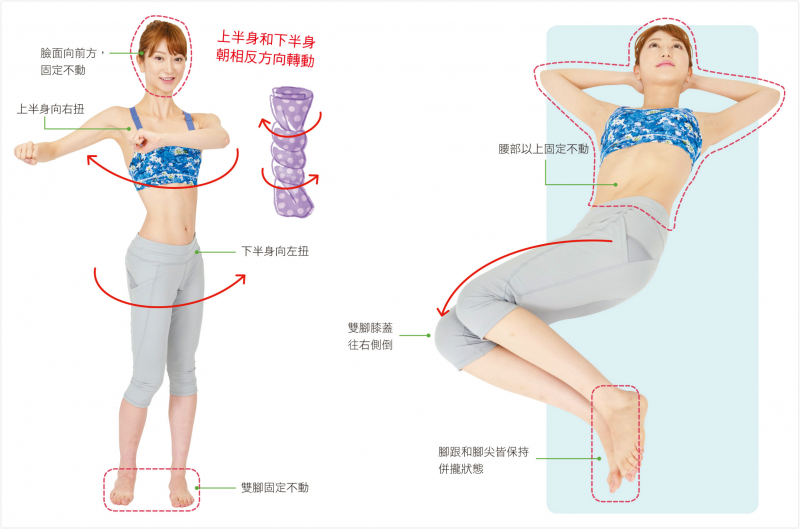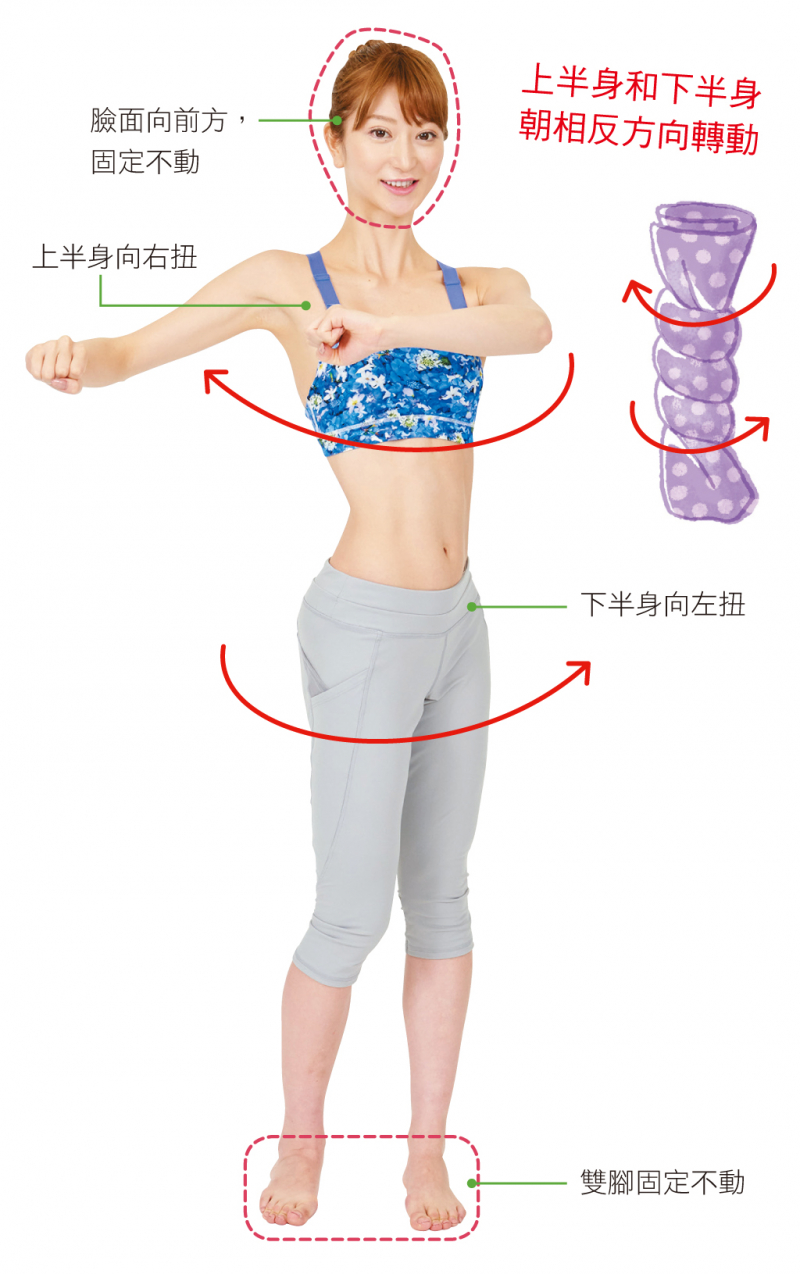 2. 上半身向右扭下半身向左轉動用力定住5秒