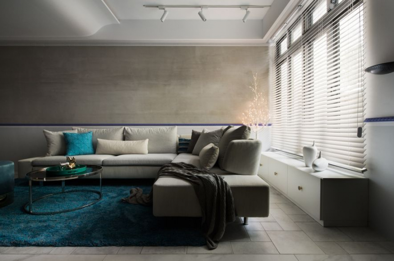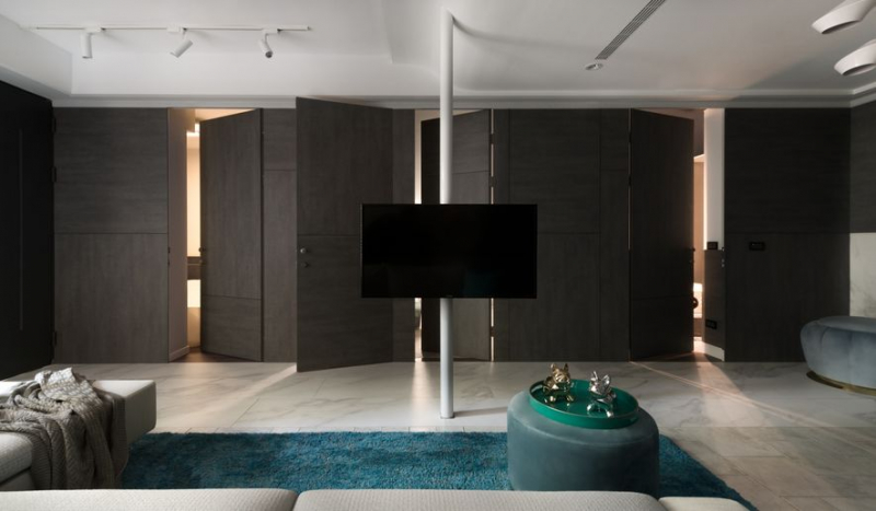 推開家門,大片窗光抖擻迎來,映亮中性色域的質感變化,以暖棕木質與清水模漆為側,天幕採用流線升降的純淨色調,地坪則適度拼貼富有淡彩的同色地磚,共同襯托象徵寬廣的蔚藍軟件,進而凸顯起居場域的休憩核心。而後,設計師打破電視「牆」的想像,將電視置於當央裝飾柱且輔以旋轉裝置,齊備觀影娛樂、訂定動線中軸之用;此外亦大幅退讓立面篇幅予私領域通道,成就其後間隔適中的三門一梯設計,且當門扇閉闔,其細緻工法更使接縫不著痕跡,將門片與私人時光妥貼隱藏,同時形塑綿長的公領域視野,放緩心情迎接晨暮變化。