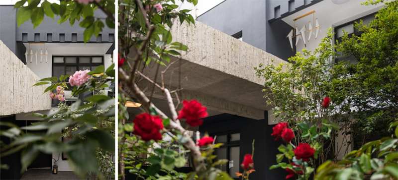 沿著滿是光影觸感的長廊前行,設計師重新整理量體外觀,以毫無雕飾的清水模雨遮,鋪陳一條通往空間核心的道路,既增添「回家」的儀式感,亦有效地提供遮陽擋雨的功能。對比之下,主體建物黑白分明的立面漆色,明確標示出分居上下的起居型態,而上層屋緣的矩形鏤空,則為畫面添上幾何趣味,使量體從外頭望進來,就像一座森林當中的方塊小屋,散發簡約而討喜的印象。靠近觀察,更會發現精心安排於二樓露台的進口燈具,簡潔鳥型與庭園綠意相呼應,率先喚醒家居的生命場景,而當牠們在晚間亮起,則化身為引領歸人的光明使者,成為標記心之所向的家屋記號。