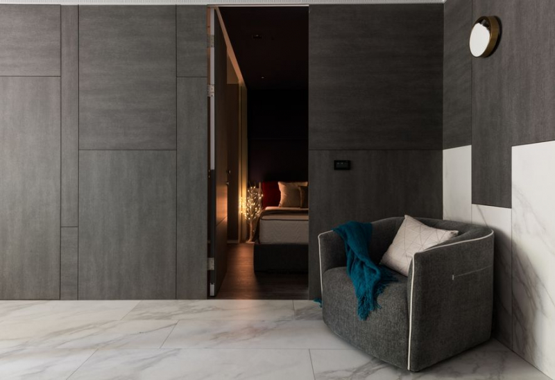 (圖)通往臥房的轉角立面,恰到好處地側向延展棕黑木質,而其下則將地磚化為牆垣,既拉伸視覺,亦與相臨角落形成上下對調的用色巧思。