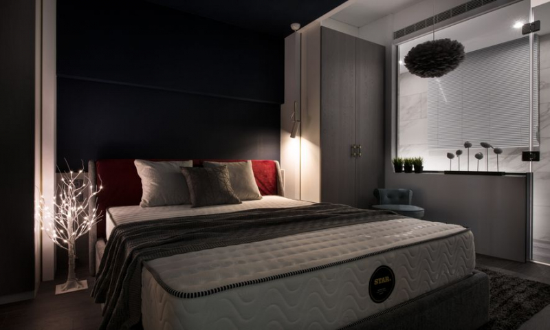 私領域有如量體向下蔓延的分枝,吸收主體精神後生長出各自樣貌。走進臥房,大片帷幕篩進光線為棕黑場景添暖;譬如在陽光中午睡,場域依循光的進程次序安排淋浴間、休憩區與臥床區塊,由明至暗的有機規劃,將沉澱許久的睡意醞釀成夢。值得一提的是中央休憩地帶,是透過天幕落差配合壁櫃定位形塑分界,再點綴雲朵吊燈、窗台迷你植栽及鳥型飾件,暗中扣合量體的自然主題,並衍生出宛如向光生長的夢中臥房。