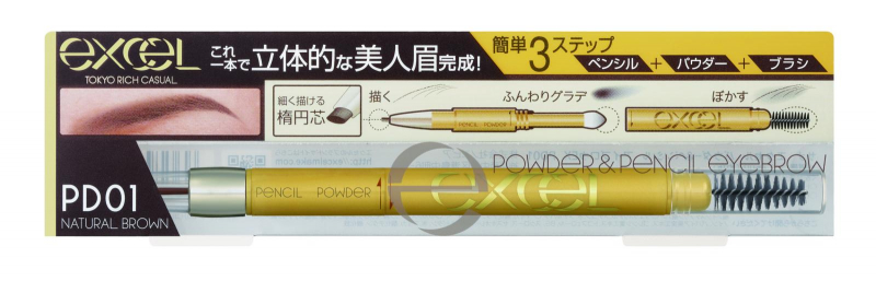 號稱開架界的精品眉筆EXCEL,不論在日本或是台灣都擁有超高回購率的明星商品-3合1持久造型眉筆!眉筆+眉粉+眉刷的3合1便利設計,搭配多樣豐富的色號選擇,讓各種髮色的女孩們都能輕鬆打造自然眉妝!