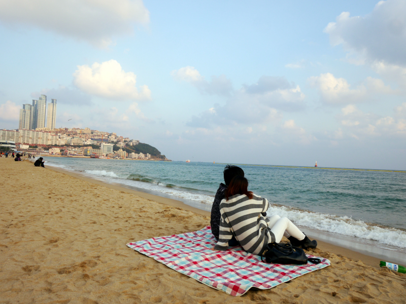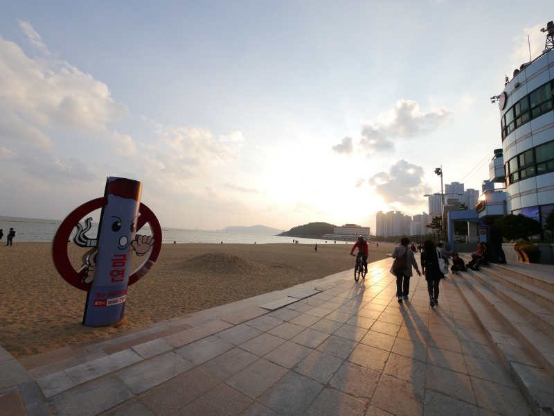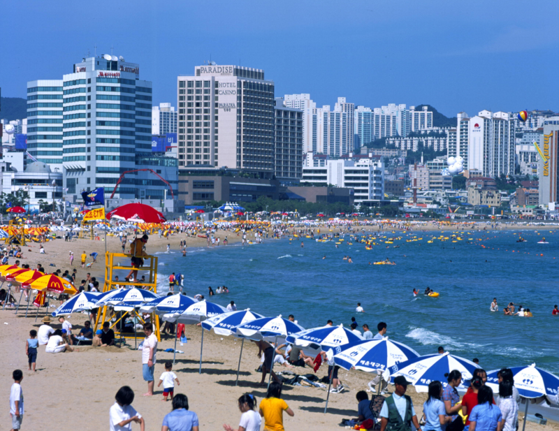 全長1.8公里、寬50米,面積58,400平方米的寬廣沙灘,擁有長長的海岸線,海鷗飛舞,白沙細軟而平整,每逢夏天便熱鬧非常,乃釜山市最著名的景點。沙灘周邊開滿特色餐廳、酒吧和大型度假酒店,終年藍天碧海,每年6月還會舉行釜山盛事「海雲台沙灘節」,儼如嘉年華沙灘派對。