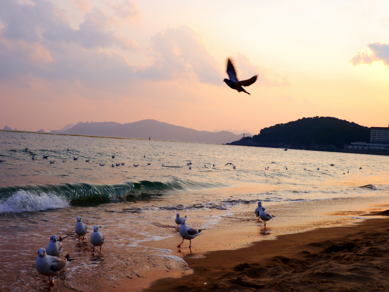 海雲台有大量海鷗聚集,且毫不怕人,配襯夕陽,構成另一幅美景。