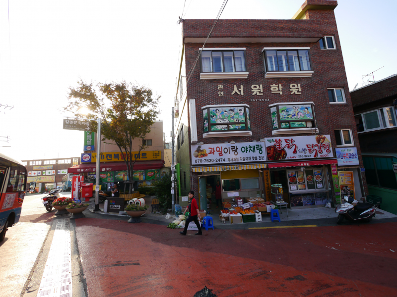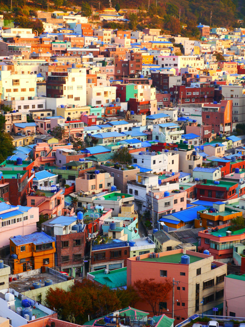 距離市中心約半小時車程的山丘,密密麻麻佈滿彩色小屋,美如水彩畫。色彩斑斕的山城背後,其實是昔日的難民村,原名「甘川洞太極村」。話說50年代韓戰爆發,首都漢城迅速淪陷,全國難民湧入釜山避難,由於土地與房屋不足,於是朝向陡斜的丘陵興建階梯式的村落。