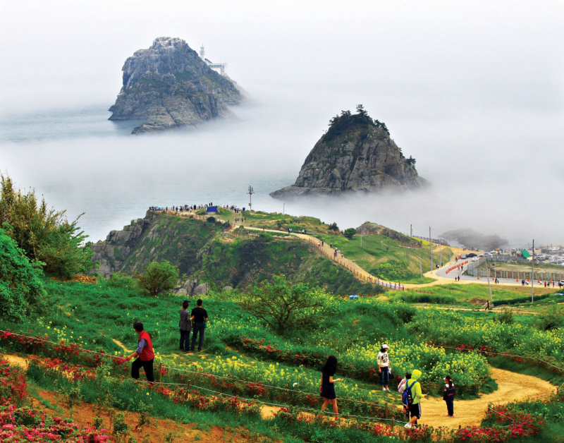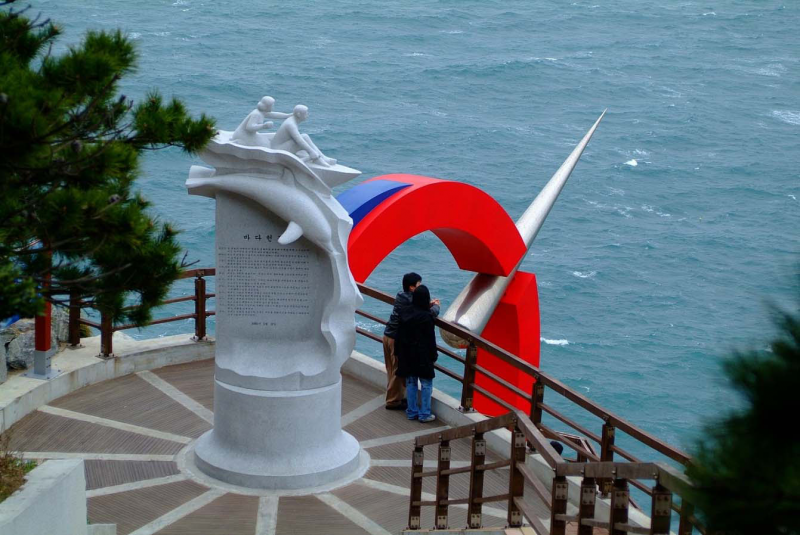 釜山南區海岸位於韓國東海與南海交界,受海浪長年侵蝕,形成像馬鞍般的小丘地形,更分裂出6個小島,昔日被稱為「乘頭馬」,一直是釜山釜山名勝。2013年更耗資14億韓元打造「天空步道」,轟立於35公尺的懸崖上,全長15公尺呈馬蹄型。行走其中,腳下是海浪澎湃的絕崖,放眼五六島美景盡入眼簾,風景超震撼!