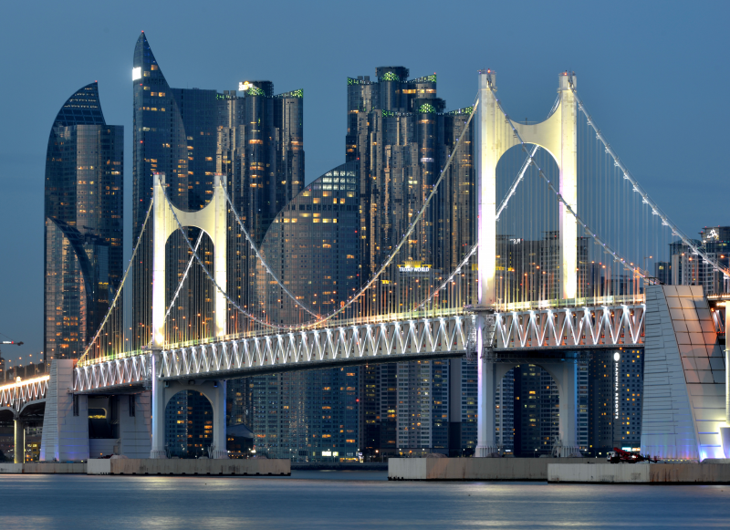 連接釜山市海雲台區和水營區,總長7.42公里,雙層複合式構造,是僅次於仁川大橋的韓國第2長大橋。廣安大橋也是韓國首座藝術性造型橋,橋上的燈光效果,能依照星期、季節而變換。旅客還可在橋上俯瞰釜山市東岸美景。