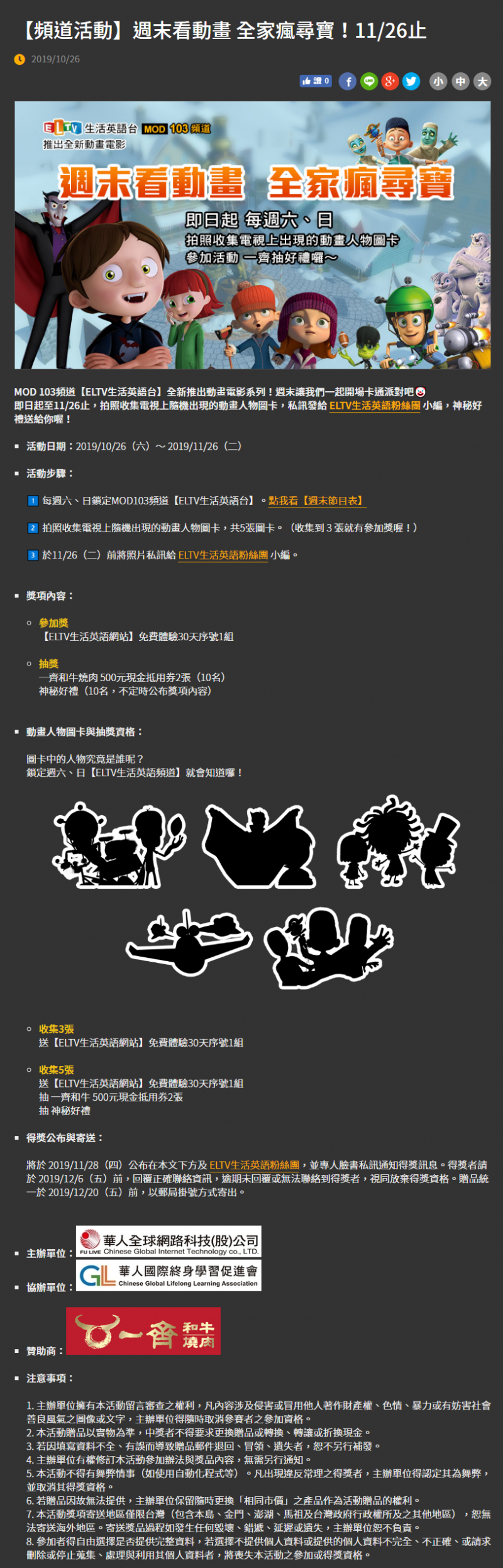 鎖定【ELTV生活英語台】,拍照收集電視上隨機出現的動畫人物圖卡,神秘好禮送給你!