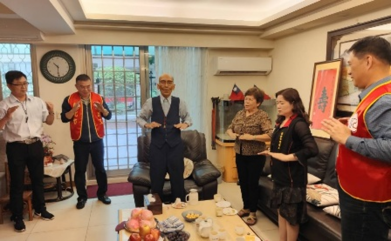 臺北市榮民服務處總幹事陳靜如(1)日偕責任區輔導員、社區志願服務組長、及榮欣志工等人一同前往居住於北投區李勝煌伯伯及翟本生伯伯住處歡度百歲生日,兩位伯伯今年剛好都滿100歲,本處衷心祝福伯伯們福如東海,福壽安康。