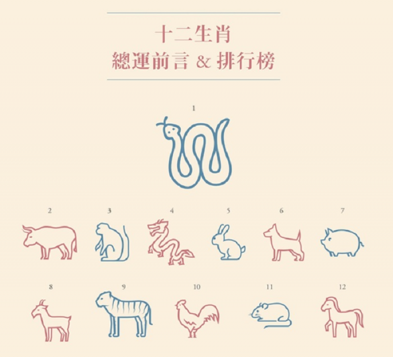 先恭喜你們了,蛇兒熬過去年的動盪和破財危機,今年在事業、人脈的表現上非常亮眼,夢想的藍圖也逐步完成,成為眾人注目之星。另外也要替牛兒高興,前兩年排名都不上不下,今年終於衝向第二,生活處處有貴人來助,只要不固步自封,並肯主動學習,任何阻礙都難不倒你。至於第三名的猴兒,揮別去年凶星環繞的險象,今年在工作上有進步的空間,責任多了,壓力也來了,但是你樂在其中,很容易得到好聲望與報酬!