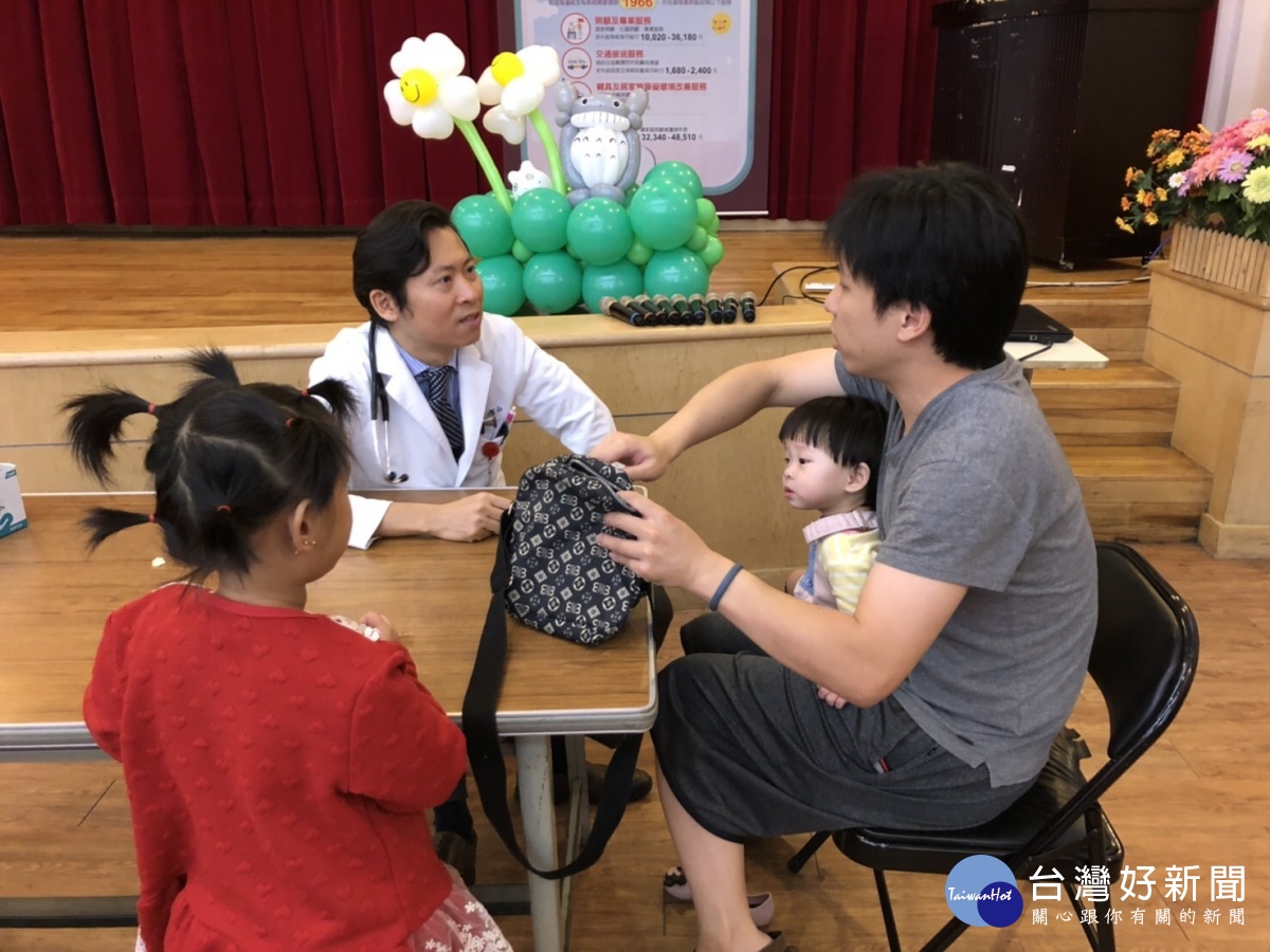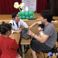 各種顏色的氣球在會場中揮舞著,大朋友小朋友都好開心!「企鵝體操」、「超神奇牙膏」、「坐火車」的小故事,說故事過程和孩子很有趣的互動,大家都跳的很努力、很開心,也讓孩子們都聽的津津有味。活動重要的義診由復健部主任葉圜叡醫師執行發展評估,還有小兒科吳君山醫師執行營養評估!