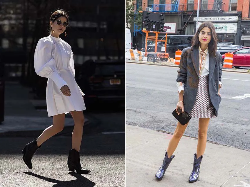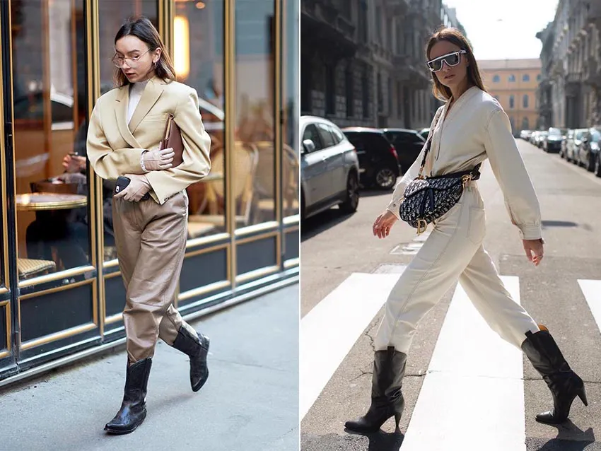 還有風靡時尚圈的連身工裝,也非常推薦搭配牛仔靴,帥度翻倍!鞋款最推中筒牛仔靴,最能打造隨興時髦感,如果擔心比例不好,可以選擇帶跟牛仔靴(右)來延長腿部線條。