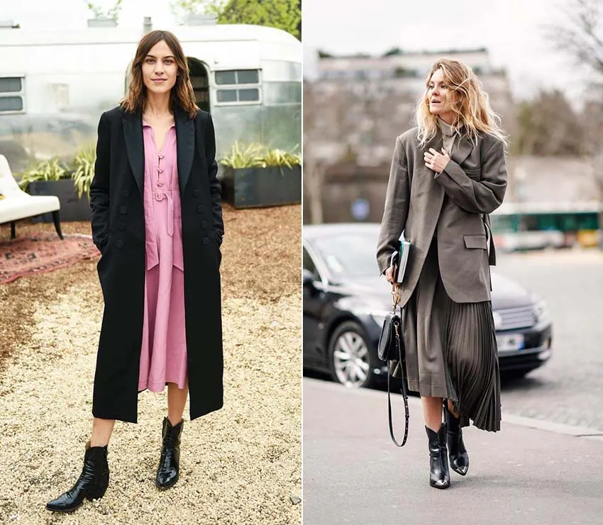搭氣質長裙也不是問題,鍾小姐Alexa Chung這一身粉色長洋裝搭小黑靴是不是格外有型(左),溫柔與帥氣並存,簡單裝扮也讓人覺得這個女孩好會穿!氣質小姐姐最愛的百褶長裙,搭小黑靴更是美出新高度,讓普通上班服變時髦。