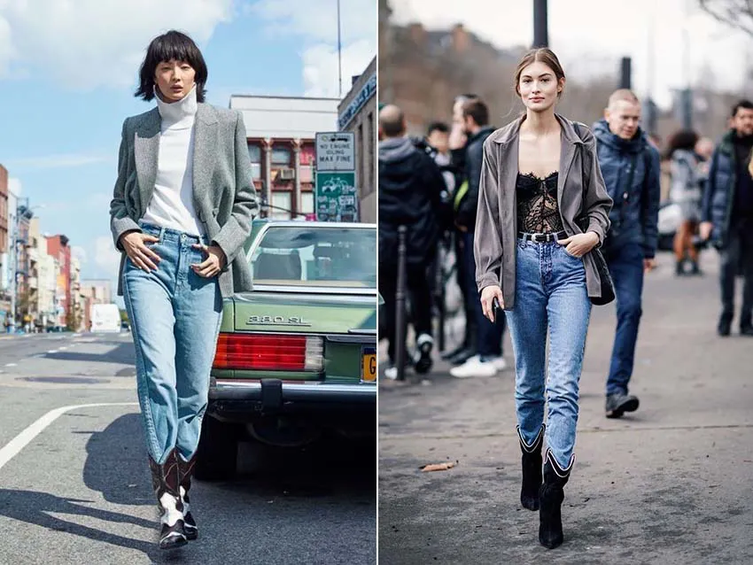 本來就是天生一對的牛仔靴及丹寧褲,搭起來絕對不會錯,立馬散發帥氣感;上衣可以選中性的高領毛衣+西外,從頭帥到尾;也可以加入女人味強烈的蕾絲元素,打造剛柔衝突的時髦感,讓牛仔靴成為畫龍點睛的時尚配件。